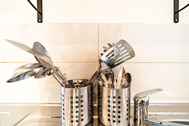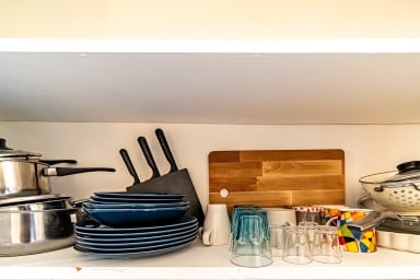 Essentials: toilet paper 🧻, shower gel 🧴, dish soap 🧼, sponge, coffee capsules ☕ & tea bags 🍵 for your arrival, plus a few cleaning products 🧽.