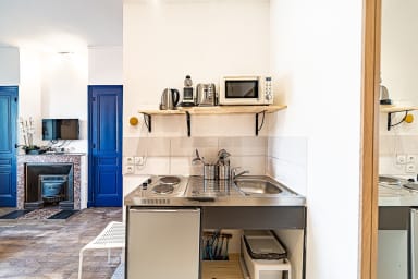 Fully equipped kitchen: electric hobs 🔌, small fridge 🧊, microwave, kettle ☕, toaster 🍞, Nespresso machine, dishes & cookware 🍽️. Dining table for 2 people.