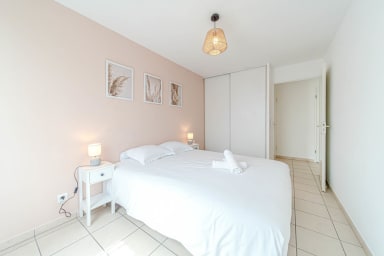 ✔️Two comfortable bedrooms: Each equipped with a double bed (160x190 cm), storage cupboards, and bedside tables. ✔️Bathroom: with bathtub, sink, storage unit, and heated towel rail.