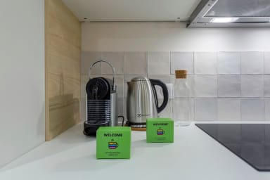 The accommodation consists of a large living area with a comfortable lounge corner featuring a sofa and TV for relaxation, a beautiful fully equipped kitchen (oven, microwave, dishwasher, Nespresso coffee machine, kettle...) and a small dining area that can seat up to 4 people.