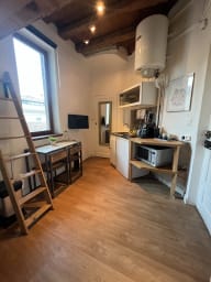 The studio features a mezzanine sleeping area with a bed (140x180 cm), be mindful of the ceiling height.