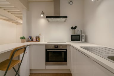 Kitchenette: Equipped with induction plates, a mini fridge, Nespresso coffee machine, toaster, dishwasher, microwave, kettle, kitchenware, utensils, and a bar with 2 high chairs.