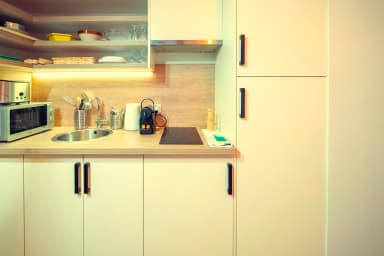 A fully equipped kitchenette with a small refrigerator, induction hob, microwave, Nespresso coffee maker, electric kettle, and toaster