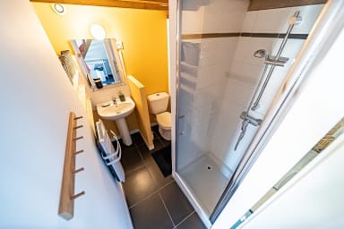 A mezzanine bedroom with sloping ceilings, accessible via a wooden staircase, with a blackout curtain separating you from the view of the living room, which features a 160x200cm double bed
