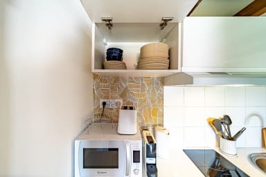 A fully equipped kitchenette with a microwave, electric stovetop, extractor fan, Nespresso coffee machine, refrigerator, oven, kettle, toaster, dishes, cutlery, and kitchen utensils.