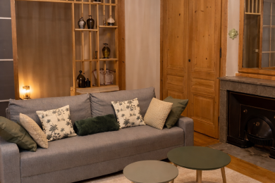 - Large living room with parquet flooring and decorative fireplace