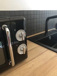 Une kitchenette équipée : plaques, micro-ondes, petit frigo, vaisselle, ustensiles, cafetière Nespresso