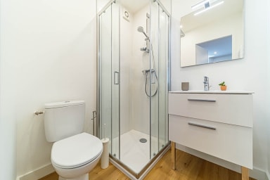 ✔ Une salle de douche avec une vasque avec rangements, sèche serviettes et sèche cheveux - WC
