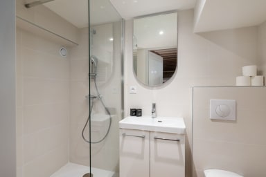 ✔️ Salle de bain : Douche moderne à l'italienne, vasque avec meuble de rangement, WC