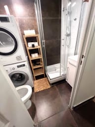 Une cuisine ouverte équipé avec un réfrigérateur avec compartiment congélation, d'une plaque induction 3 feux, d'un four multifonction,d'un four micro-ondes, d'un lave-vaisselle, d'une cafetière, d'un gille pain, une bouilloire, d'un aspirateur, d'un fer et planche à repasser, d'un défroisseur a main( trés pratique pour robe ou chemise)