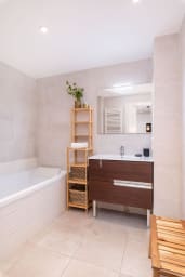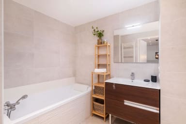 🚿 Une jolie salle d’eau avec une baignoire, un meuble de rangement, un sèche-serviettes et un sèche-cheveux