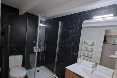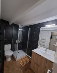 Salle de bain entièrement rénovée avec douche, WC et chauffe-serviette.